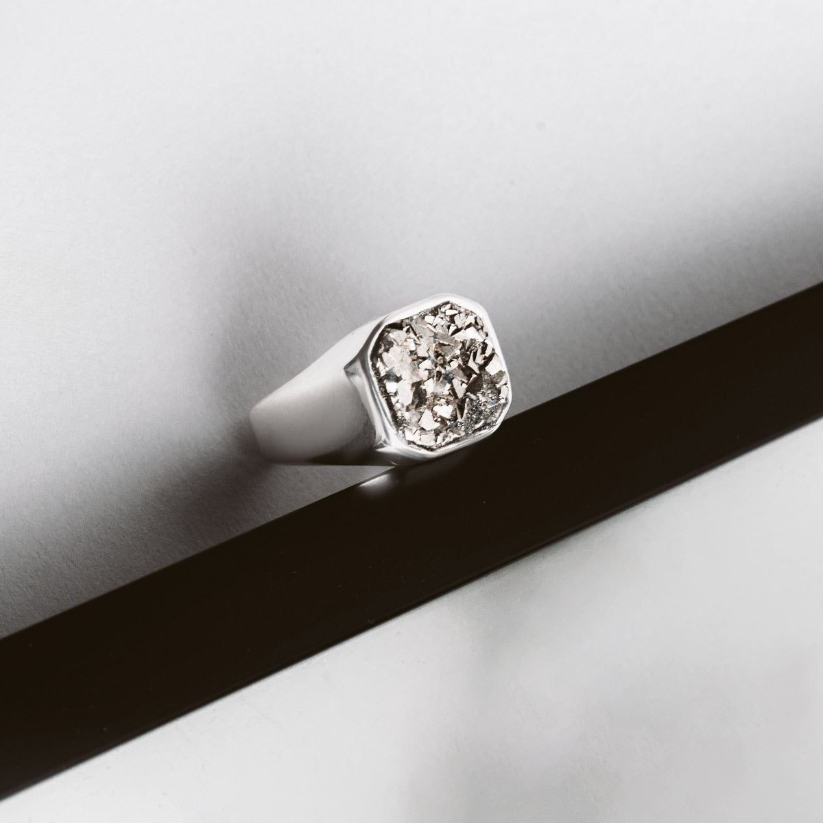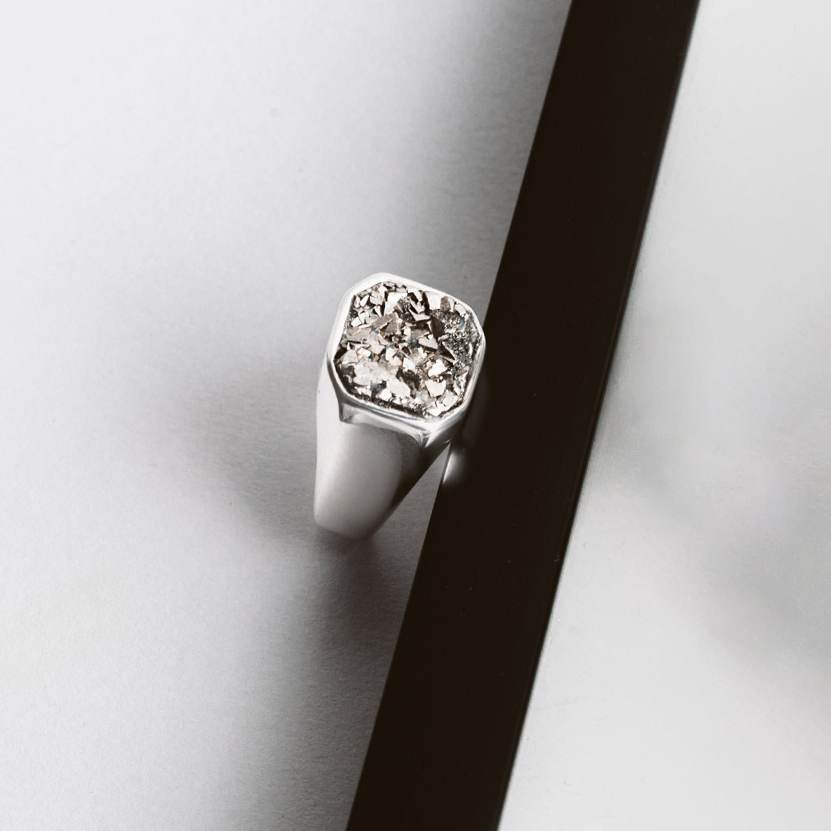 Entdecken Sie Mounim, einen Siegelring aus Sterlingsilber für den modernen Mann von heute. Sein Herzstück ist ein 100% natürlicher Pyrit-Druzy-Stein. Er ist bekannt für seine lichtbrechenden und reflektierenden Eigenschaften. Jeder Stein ist einzigartig in seiner Form und Reflexion, genau wie der Mann, der ihn trägt.
