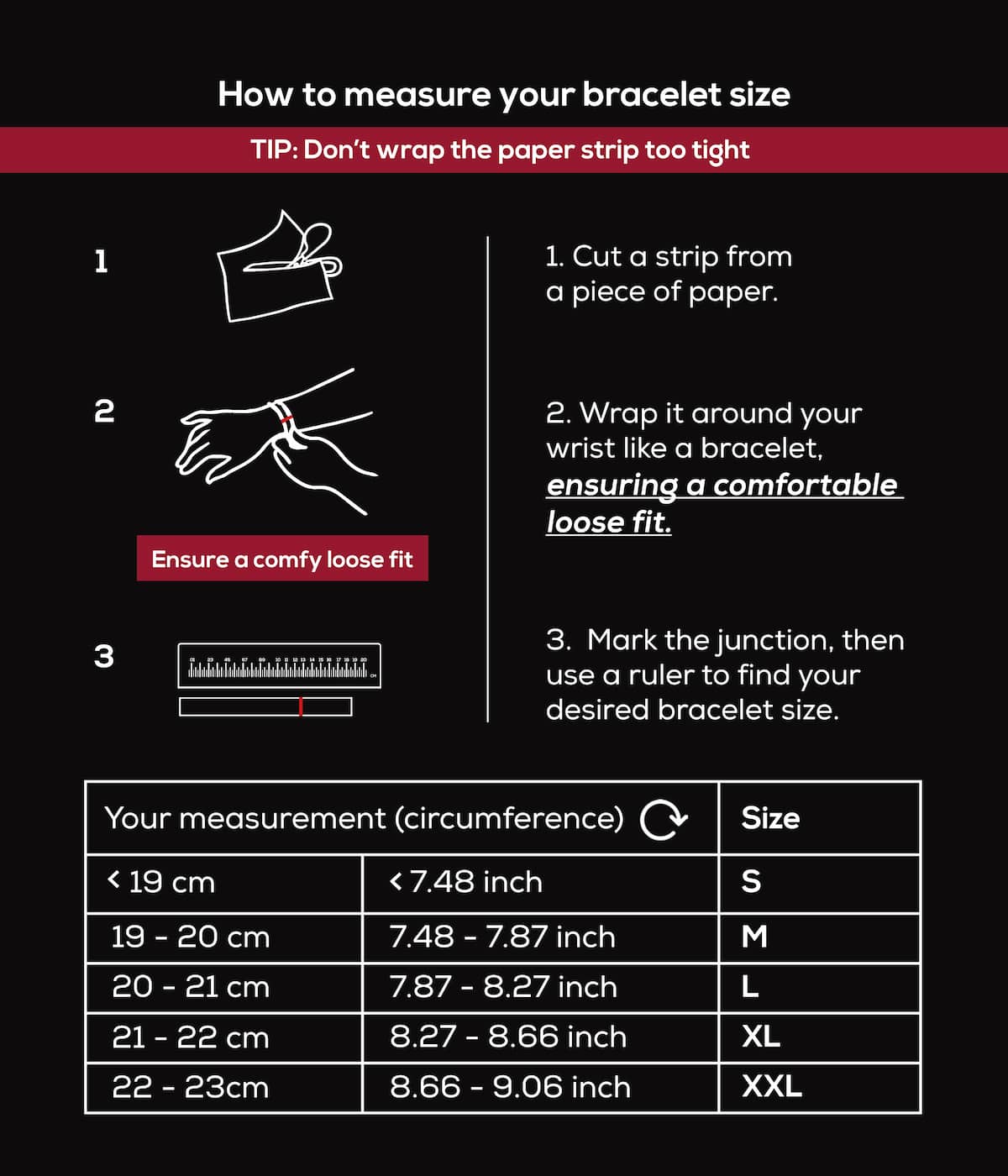 Si votre taille n'est pas disponible, contactez-nouset nous vous fabriquerons un bracelet personnalisé sans frais supplémentaires !