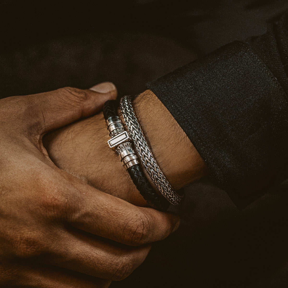Mirel - Bracelet en cuir noir véritable avec argent sterling 7mm