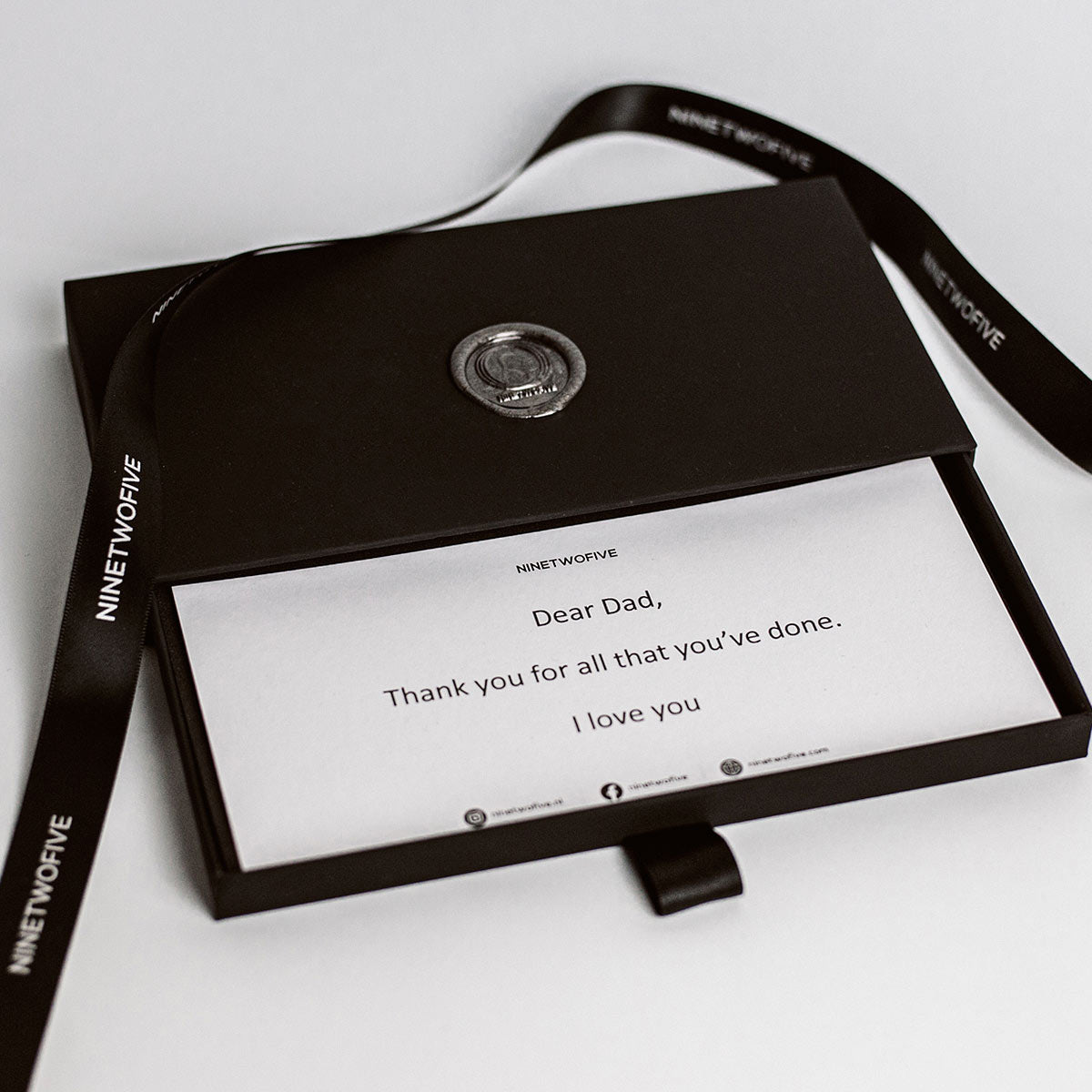 Lorsque vous choisissez un cadeau chez NineTwoFive, vous optez pour une expérience complète. Vous avez non seulement la possibilité de personnaliser un bracelet pour homme, mais aussi d'ajouter une note personnelle à votre cadeau. Cette note, exprimant vos sentiments ou vos souhaits, sera la première chose qu'il verra lorsqu'il ouvrira le paquet, ce qui rendra l'expérience de déballage encore plus spéciale. Cette touche personnelle supplémentaire reflète le soin apporté à la sélection du cadeau et lui montre à quel point il compte pour vous. En lisant vos mots et en voyant le bracelet que vous avez choisi, il saura que ce cadeau est plus qu'un simple bijou. C'est l'expression de vos souvenirs communs, de votre affection et de votre respect.