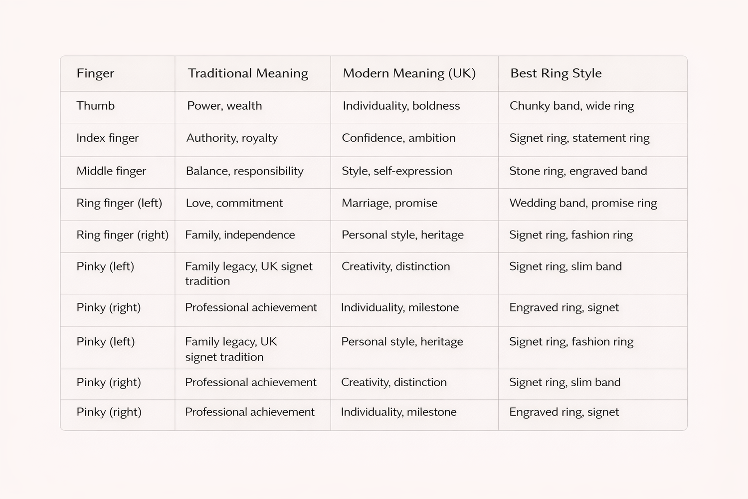 Le tableau ci-dessus montre que chaque doigt est associé à la fois à une signification traditionnelle et à une interprétation moderne. De nos jours, la plupart des hommes combinent les deux, choisissant le doigt sur lequel porter la bague en fonction de sa signification personnelle plutôt que selon des conventions strictes.