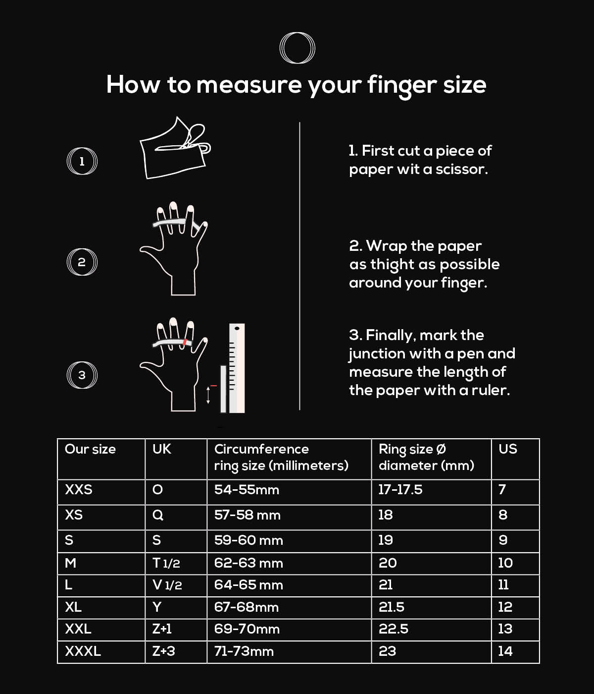 - Vind je ringmaat - Je maat wordt aangegeven op het snijpunt van de sizer.